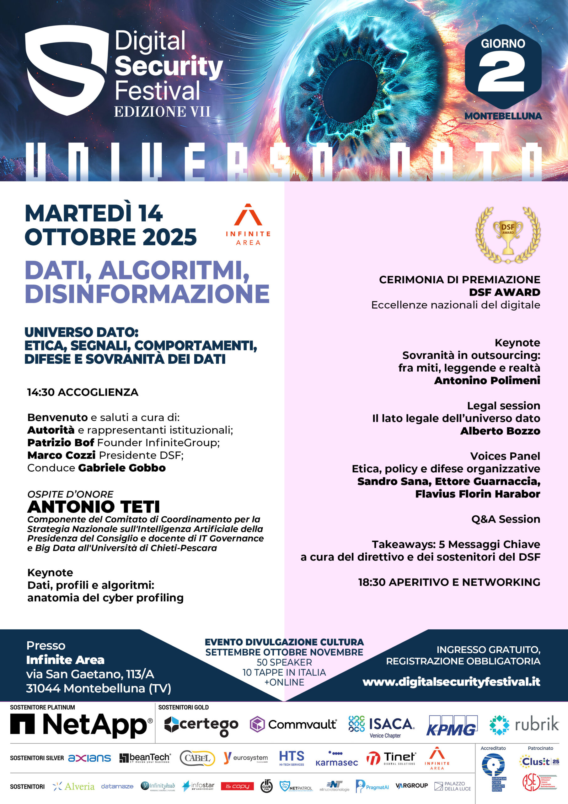 “Universo dato” è il sottotitolo e il tema della settima edizione del Digital Security Festival 2025: l’edizione del grande salto nazionale. Questo concetto evidenzia il ruolo centrale dei dati nell’ennesima rivoluzione digitale e nell’evoluzione umana, in cui ogni informazione contribuisce a costruire un ecosistema interconnesso, pur mantenendo le persone sempre al centro.