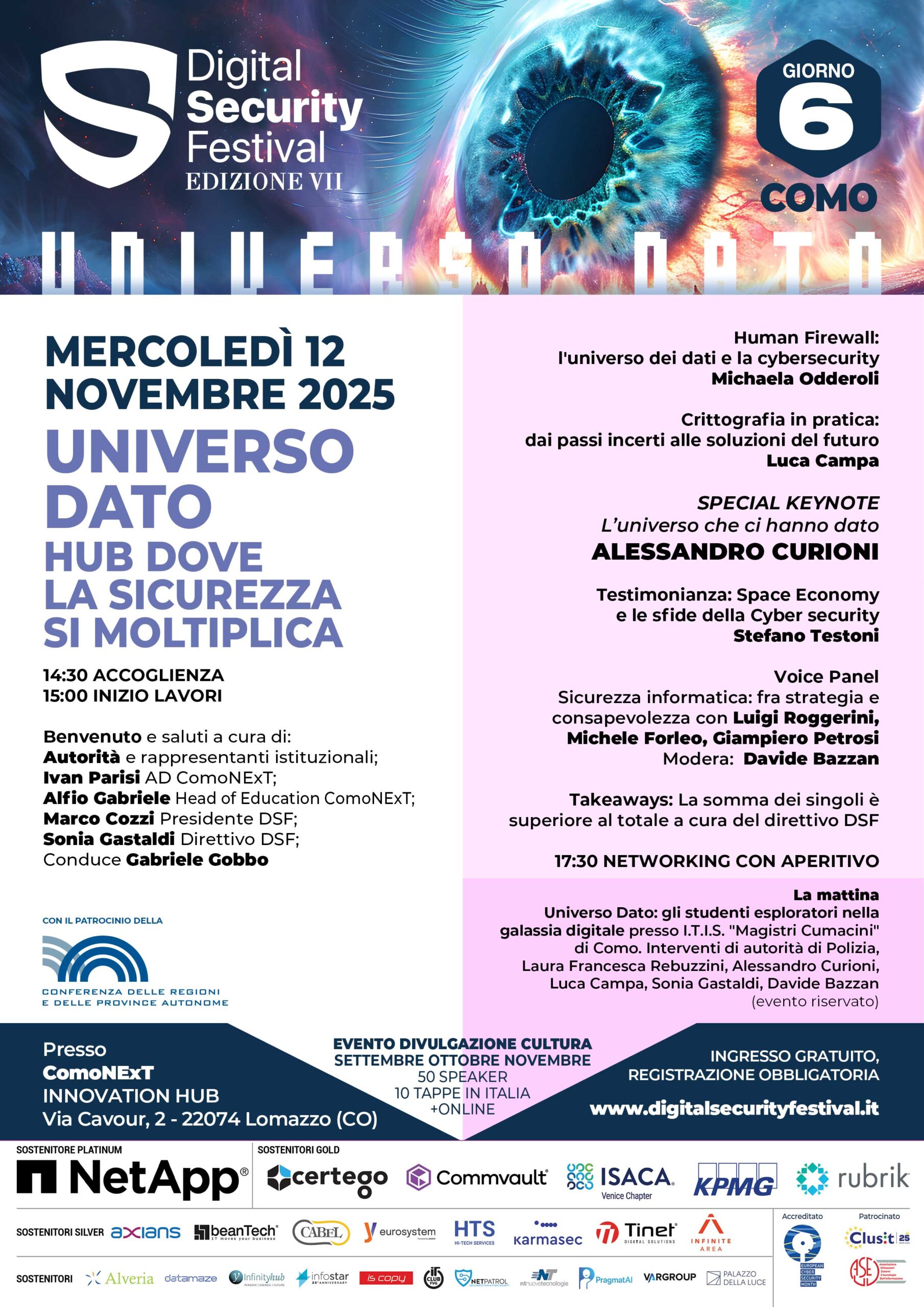 “Universo dato” è il sottotitolo e il tema della settima edizione del Digital Security Festival 2025: l’edizione del grande salto nazionale. Questo concetto evidenzia il ruolo centrale dei dati nell’ennesima rivoluzione digitale e nell’evoluzione umana, in cui ogni informazione contribuisce a costruire un ecosistema interconnesso, pur mantenendo le persone sempre al centro.