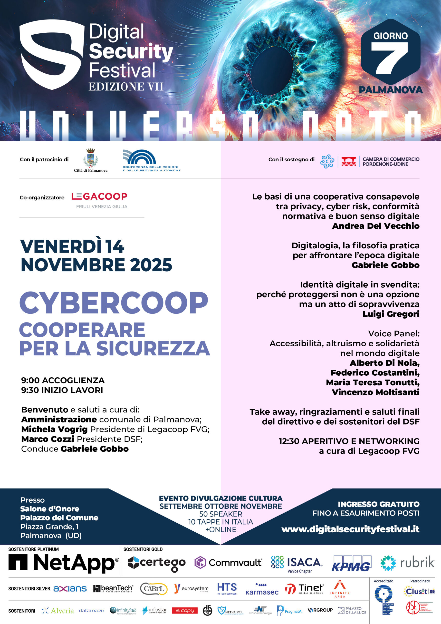 Benvenuti al Digital Security Festival, un evento che non è solo un’occasione di apprendimento, ma una vera e propria immersione nel mondo della sicurezza digitale, progettato per coinvolgere e sensibilizzare tutti: dai giovani agli adulti, dalle imprese alle istituzioni, coinvolgendo scuole e università. Ma la vera forza del Festival è la sua accessibilità. Abbiamo voluto creare un programma che parli a tutti, senza tecnicismi inutili, con l’obiettivo di rendere la sicurezza digitale alla portata di chiunque. Partecipare al Digital Security Festival è molto più che seguire conferenze o seminari: è investire nella propria sicurezza, imparando a riconoscere i pericoli e a diventare cittadini digitali consapevoli. In un mondo sempre più “Onlife”, dove la vita online e offline si fondono, questo evento vi offrirà competenze essenziali per vivere serenamente e in sicurezza.