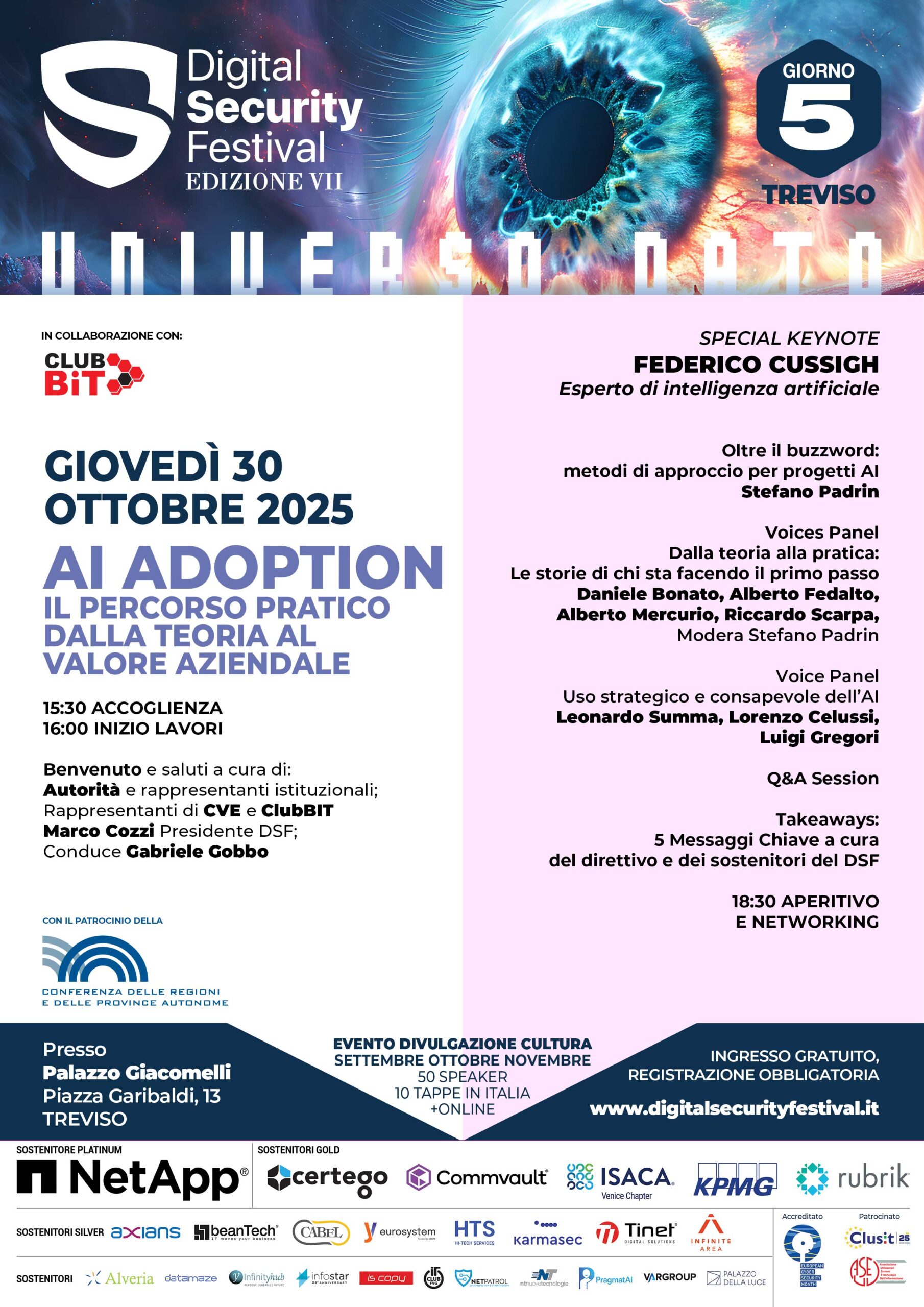 Dopo le tappe alla Camera dei Deputati e a Udine, Montebelluna, San Marino e Trieste, il Digital Security Festival torna a focalizzarsi sulle imprese con un evento dedicato all’adozione pratica dell’Intelligenza Artificiale. Giovedì 30 ottobre, a Treviso presso Palazzo Giacomelli, si terrà un pomeriggio di lavori per passare “dalla teoria al valore aziendale”. Special keynote dell’esperto AI Federico Cussigh e focus su metodi di approccio ed esperienze concrete.