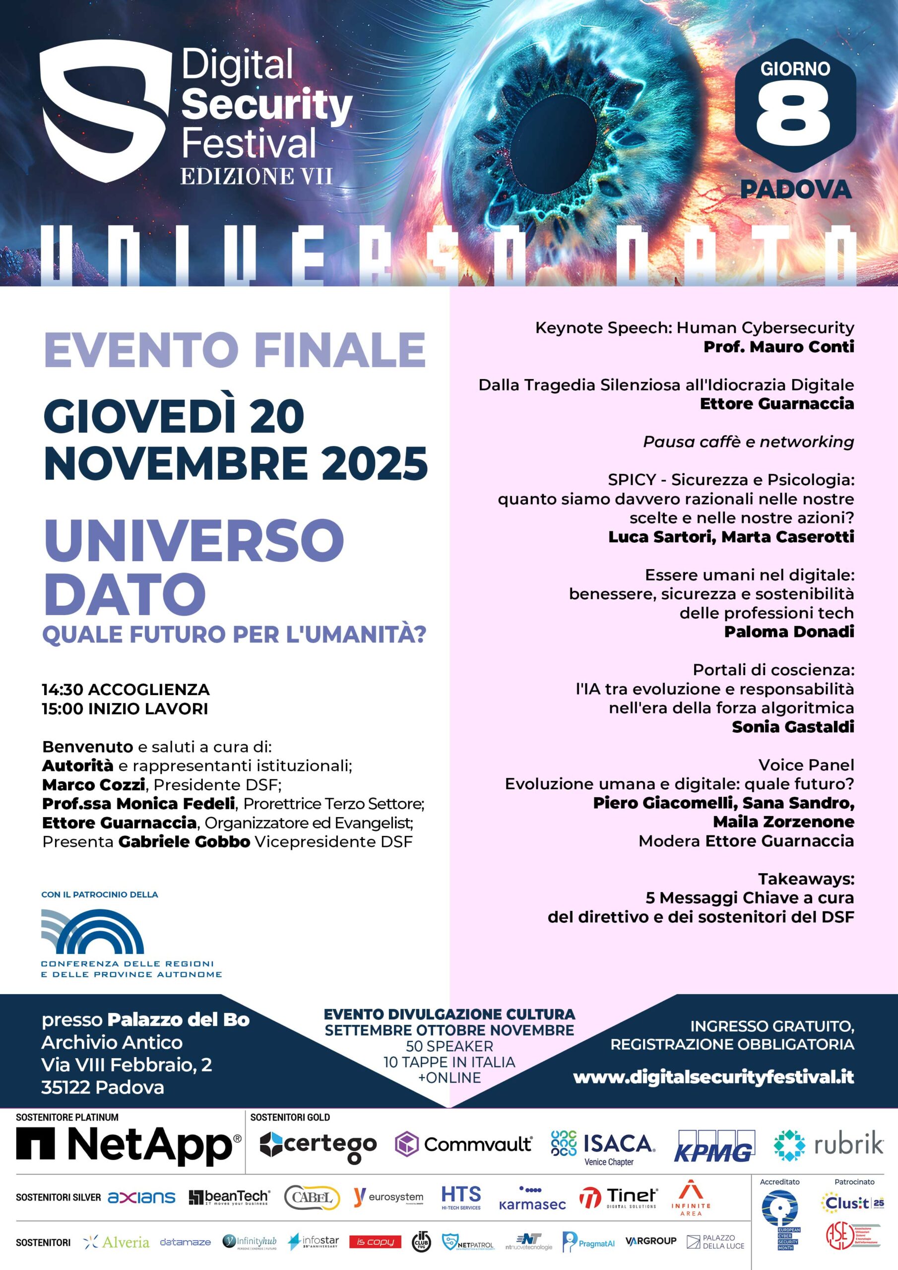 La chiusura della settima edizione si terrà giovedì 20 novembre in una delle sedi più simboliche della cultura e del sapere italiano: l’Archivio Antico presso il Palazzo del Bo, sede storica dell’Università di Padova. Il titolo dell’evento è una domanda che chiude il percorso #UniversoDato: “Quale futuro per l’umanità?“.