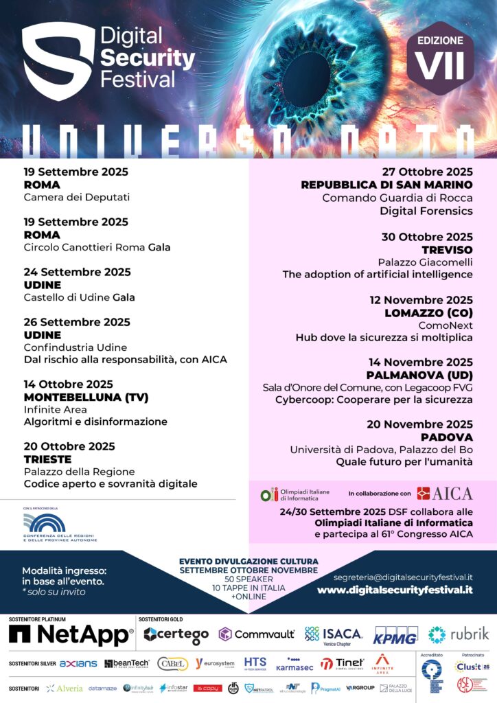 L’evento è patrocinato dalla Conferenza delle Regioni e delle Province Autonome, da Clusit e da Aused, ed è accreditato all’European Cybersecurity Month (ECSM). L’ingresso è gratuito, previa registrazione obbligatoria su questa pagina dedicata.